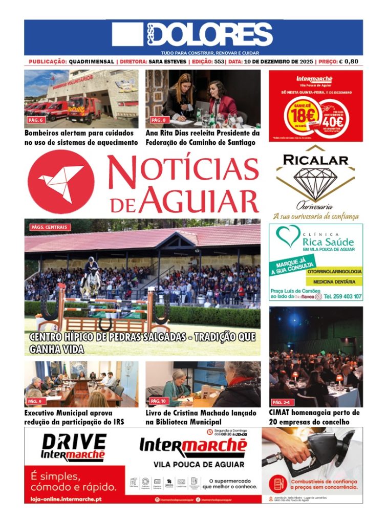 Capas Edição 553 Por: Redação Data: 10 de Dezembro, 2025 Artigo anteriorCIMAT homenageia perto de 20 empresas de Vila Pouca de Aguiar que captaram investimento para o territórioPróximo artigo“Centro Hípico de Pedras Salgadas — Tradição que ganha vida” Redação Partilhar FacebookWhatsAppEmail Últimas “Centro Hípico de Pedras Salgadas — Tradição que ganha vida” CIMAT homenageia perto de 20 empresas de Vila Pouca de Aguiar que captaram investimento para o território Subscritor de petição defende reabertura da Linha do Corgo em audição parlamentar CIM do Alto Tâmega e Barroso distinguida com Menção Especial no Prémio Nacional da Paisagem 2025 Lojistas reúnem-se em espírito natalício para decorar a rua com uma árvore de Natal Artigos relacionadosRelacionado “Centro Hípico de Pedras Salgadas — Tradição que ganha vida” Redação - 10 de Dezembro, 2025 O Centro Hípico de Pedras Salgadas (CHPS) está dotado... CIMAT homenageia perto de 20 empresas de Vila Pouca de Aguiar que captaram investimento para o território Redação - 10 de Dezembro, 2025 A Comunidade Intermunicipal do Alto Tâmega e Barroso (CIMAT)... Subscritor de petição defende reabertura da Linha do Corgo em audição parlamentar Redação - 10 de Dezembro, 2025 A Assembleia da República ouviu na quinta-feira, 04 de... CIM do Alto Tâmega e Barroso distinguida com Menção Especial no Prémio Nacional da Paisagem 2025 Redação - 10 de Dezembro, 2025 A Comunidade Intermunicipal do Alto Tâmega e Barroso (CIMAT)...