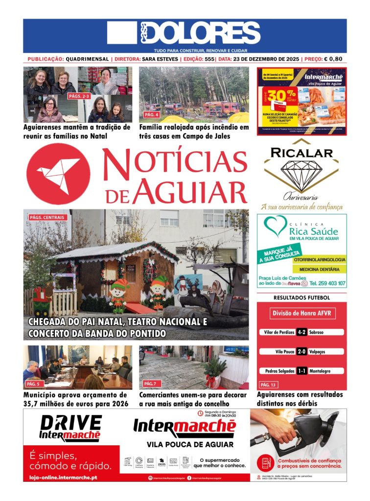 Capas Edição nº 555 Por: Redação Data: 23 de Dezembro, 2025 Artigo anteriorChegada do Pai Natal, teatro nacional e concerto da Banda do PontidoPróximo artigoMAI reuniu cerca de 350 pessoas no primeiro Jantar de Natal do movimento Redação Partilhar FacebookWhatsAppEmail Últimas Alunos do curso de Cozinha e Pastelaria conhecem medidas de empreendedorismo jovem ULS Trás-os-Montes e Alto Douro nega acusações do Sindicato sobre horas extraordinárias e progressões na carreira médica Exposição “Tempo da Travessia: Símbolos da Quaresma” patente no Welcome Center de Pedras Salgadas Aprovados 31 pontos em reunião do executivo da Câmara Municipal de Vila de Pouca de Aguiar ARTimanha regressa à serra do Alvão em 2026 com identidade visual renovada Artigos relacionadosRelacionado Alunos do curso de Cozinha e Pastelaria conhecem medidas de empreendedorismo jovem Redação - 13 de Março, 2026 A Associação Empresarial do Corgo (AE Corgo) realizou na... ULS Trás-os-Montes e Alto Douro nega acusações do Sindicato sobre horas extraordinárias e progressões na carreira médica Redação - 13 de Março, 2026 A Unidade Local de Saúde de Trás-os-Montes e Alto... Exposição “Tempo da Travessia: Símbolos da Quaresma” patente no Welcome Center de Pedras Salgadas Redação - 13 de Março, 2026 A Loja Interativa de Turismo, do Welcome Center em... Aprovados 31 pontos em reunião do executivo da Câmara Municipal de Vila de Pouca de Aguiar Redação - 13 de Março, 2026 A Câmara Municipal de Vila Pouca de Aguiar reuniu...