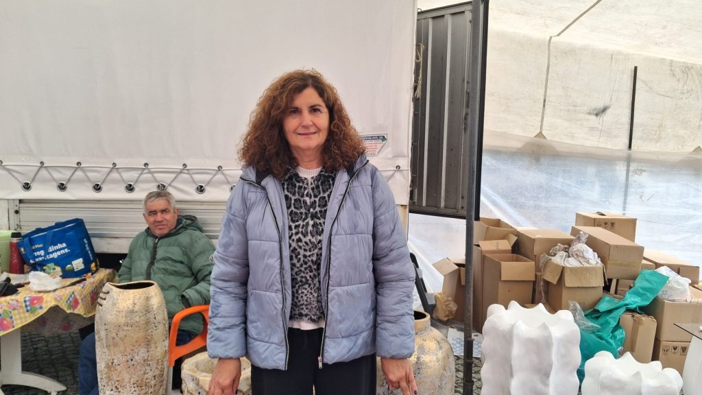 Maria do Carmo Giroto, de 62 anos, é de Lamego e já é presença habitual nas feiras regulares de Vila Pouca de Aguiar, há pelo menos 35 anos, onde apresenta louça regional de Barcelos, no largo em frente ao Tribunal. Refere-se à afluência como “muito fraca, talvez derivada do tempo”, mas indica que “não é só aqui, é em todo o lado, não há dinheiro, não há mesmo dinheiro, as pessoas querem comprar, mas não há dinheiro”, remetendo para outras feiras que faz. “Ainda por cima o meu produto não é de primeira necessidade, então as pessoas não compram tanto”, explica.