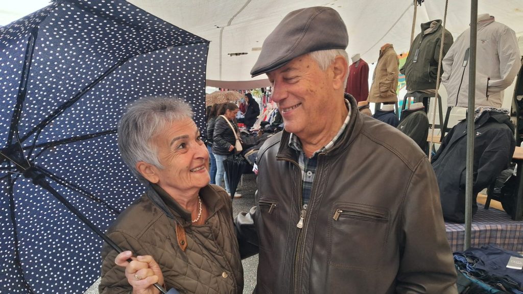 Residentes na freguesia de Vila Pouca de Aguiar, o casal Avelino Gomes, de 78 anos, e São Borges, de 76, mostram um outro lado que a Feira dos Santos pode trazer, uma vez que a frequentam, sobretudo, pelo convívio. “É para passear, conversar, porque se encontra muita gente conhecida, e passa-se aqui um bocado de tempo”. Em dia de chuva, e apesar do propósito do passeio, acabaram por comprar um guarda-chuva. “Gostei muito do padrão e já precisava de um novo”, comenta São Borges. Aconselham a que se visite a feira, contudo deixam também uma nota em relação à organização do espaço. “A parte da rua está muito deserta, deviam orientar as coisas de maneira que não se concentrassem só aqui, porque realmente a parte de cima, na praça, fica vazia”. Apesar desta questão, admitem que “há que admirar a extensão da feira que é extraordinária”.