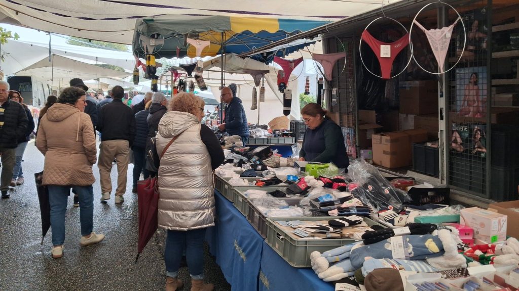 Afirma que os seus produtos mais baratos, os packs de três collants a cinco euros, “ainda vão saindo, agora o meu filho, aqui ao lado, já não consegue, se não fosse eu a ajudá-lo era complicado”. Na banca do lado estava a nora e a feirante explica que o filho “já optou por outra vida, faz festas com uma rulote de crepes e farturas”.