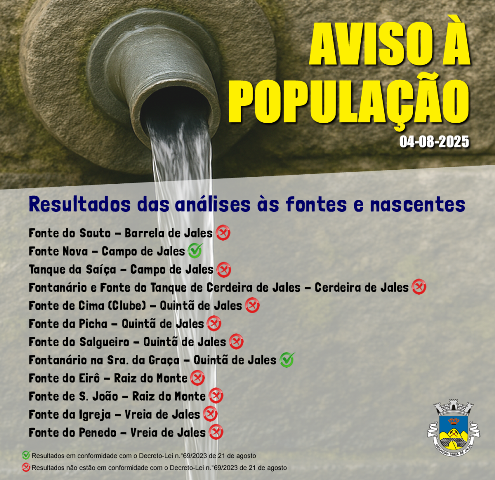 De acordo com a informação prestada pela autarquia no seu site, foram analisadas 12 fontes e nascentes, e apenas a Fonte Nova, em Campo de Jales, e o fontanário da Senhora da Graça, localizado em Quintã de Jales, apresentaram resultados em conformidade com a legislação em vigor.