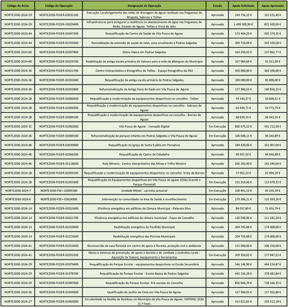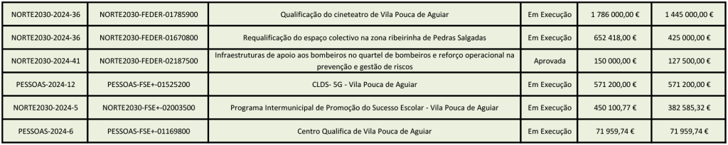 Entre as candidaturas recentemente aprovadas, destacam-se intervenções estruturantes nas áreas da água, saúde, educação, proteção civil e requalificação urbana, num investimento global de cerca de dez milhões de euros que contribuirá para um concelho mais coeso, moderno e sustentável, conforme quadro abaixo em anexo.